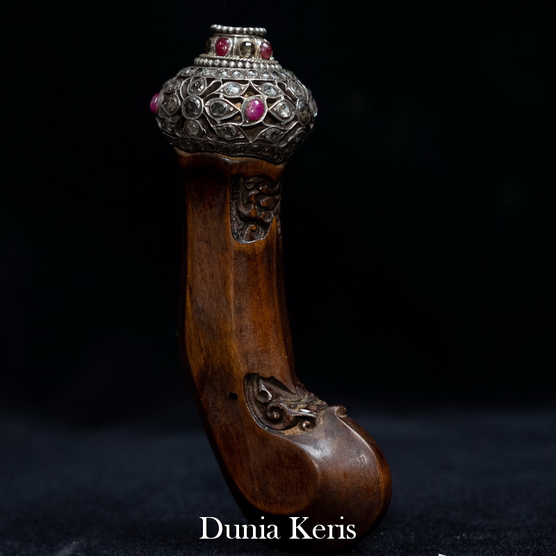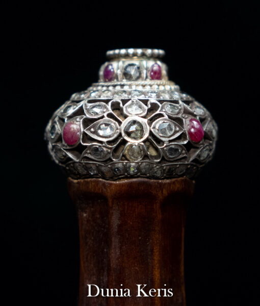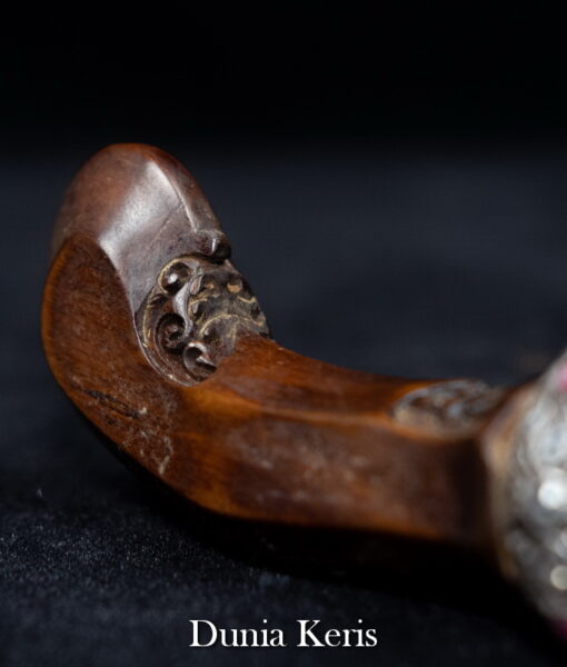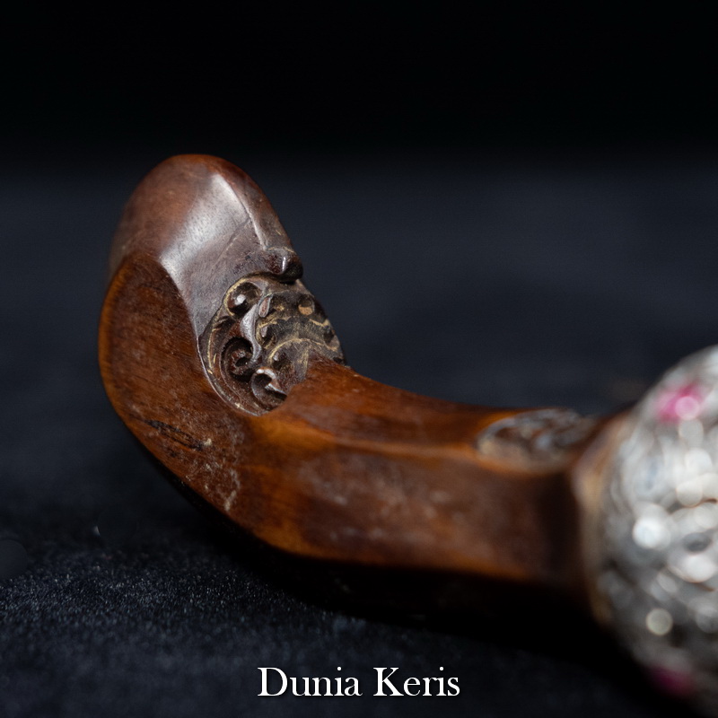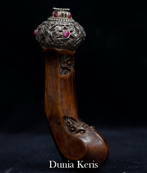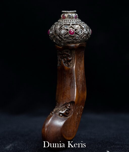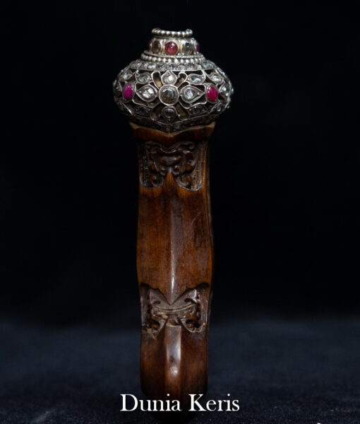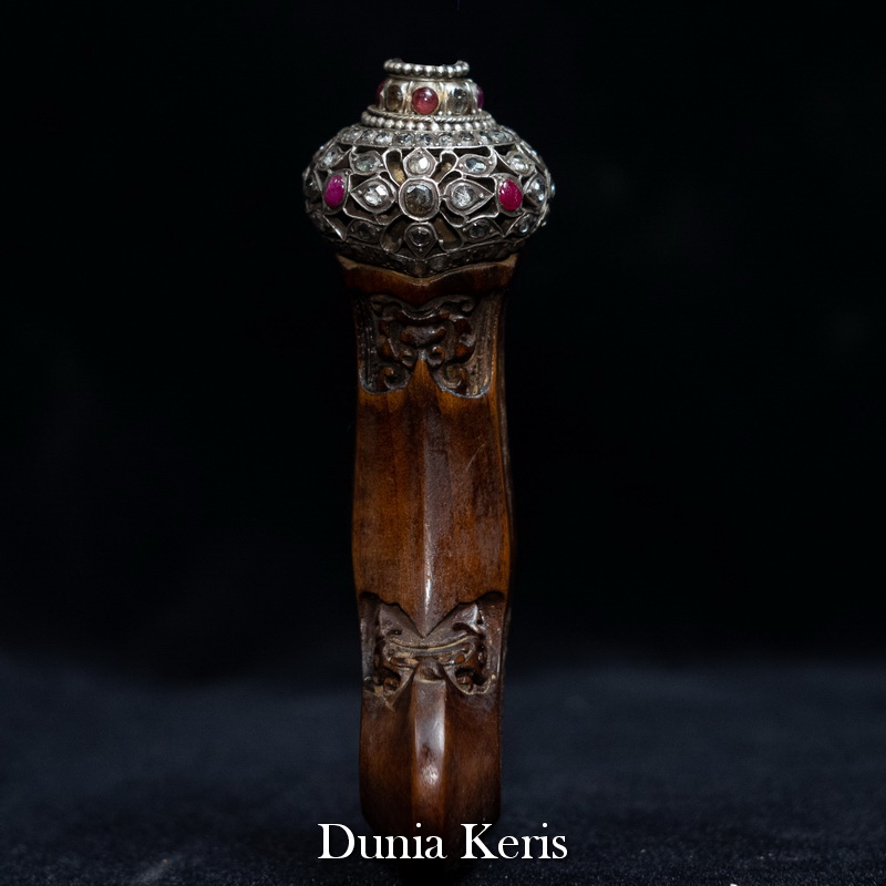 Deder Mendak Selut Krumpul Surakarta berbahan perak asli bertatahkan intan & rubi, dipadukan dengan deder kayu Kemuning Bang pilihan. Perpaduan mewah dan anggun, cocok untuk pelengkap keris koleksi maupun hadiah istimewa.